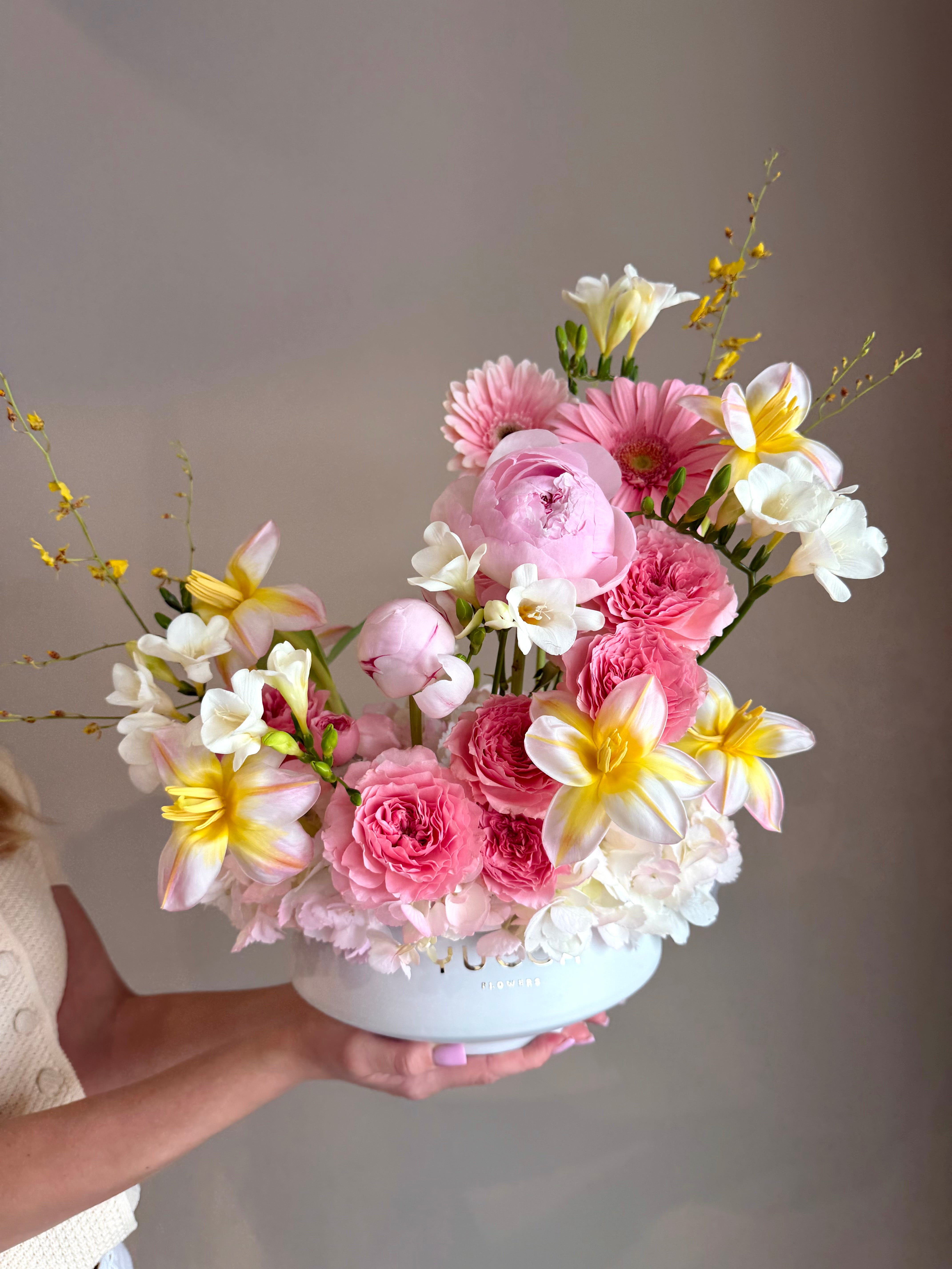 A dreamy embrace of soft ivory o‘hara rose, spray roses, arranged in signature box — a statement of pure elegance and romance. For those unforgettable moments that should be cherished.